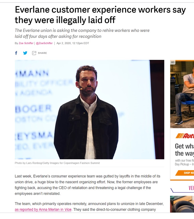 This article by Zoe Schiffer in The Verge reports on the controversy around Everlane laying off workers who wanted to unionize at the onset of the pandemic in 2020.
